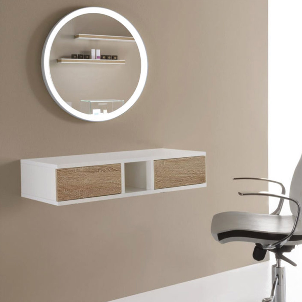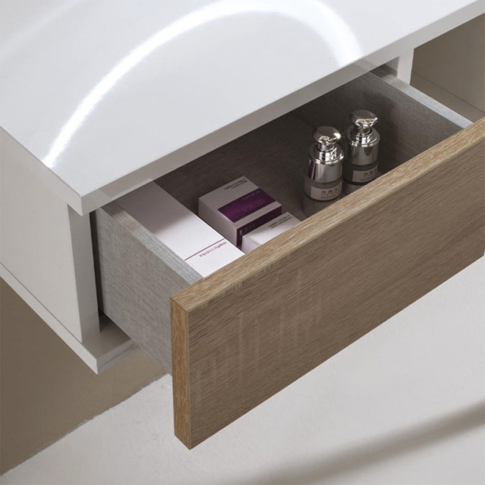 Struttura in legno nobilitato bianco opaco e cassetti frontali dotati di pushpull disponibili in 3 diverse finiture.Il mobiletto può essere sospeso o dotato di gambe cromate opzionali.